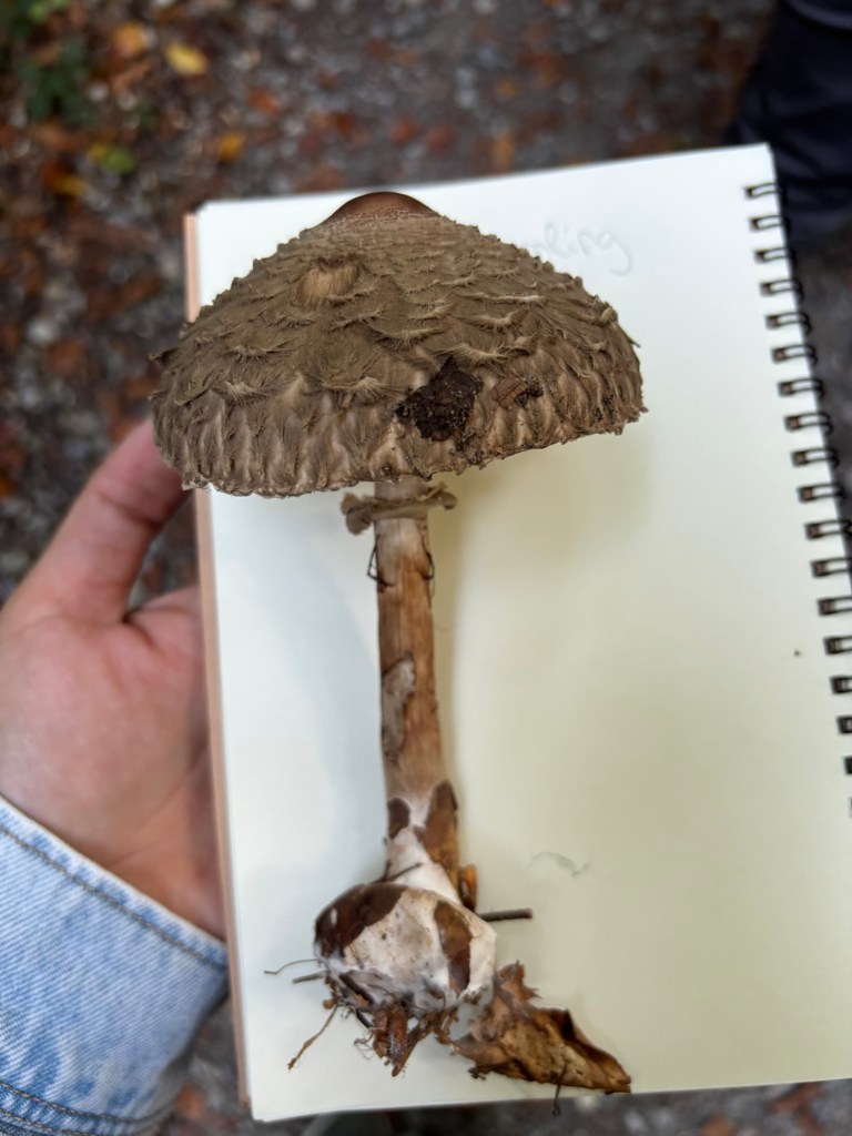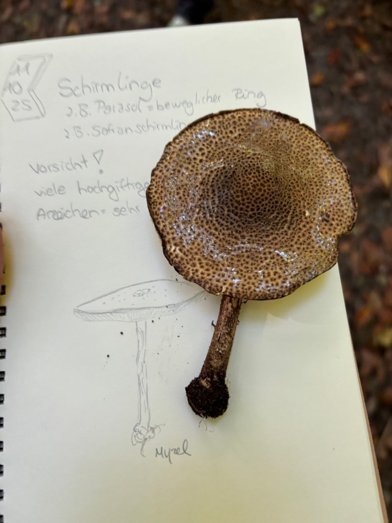 Bei einer Tour mit den Kindern wäre es nun also möglich, dass du anstatt mit dem Korb die Pilze zu sammeln, einfach Skizzen und Bilder vom Pilz erstellst. Hierbei schaut ihr euch genau an, wie der Pilz aufgebaut ist, wo und wann ihr ihn gefunden habt, wie er riecht und ob bereits Tiere hier geknabbert haben. Hat er Lamellen? Oder Röhren? Wo wächst er? Hat er einen Ring? Wie sieht der Stiel aus? Ein Bestimmungsbuch kann anschließend erste Hinweise darauf liefern, welcher Pilz das sein könnte. Trotzdem darf er an Ort und Stelle bleiben, denn er ist ja nun im Skizzenbuch verewigt.