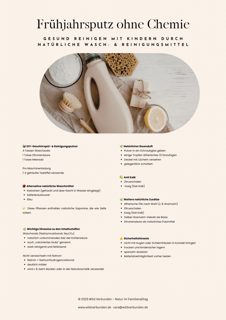 In diesem Freebie findest du eine kompakte Übersicht rund um praktische DIY-Rezepte für Waschmittel, Spülmittel, Anti-Kalk-Reiniger und Geschirrspülpulver, auf Basis natürlicher Zutaten.